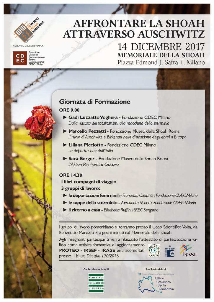 Affrontare la Shoah attraverso Auschwitz è una giornata di formazione organizzata il 14 dicembre 2017 dalla Fondazione CDEC e CGIL CISL UIL Lombardia, in collaborazione col Memoriale della Shoah di Milano.