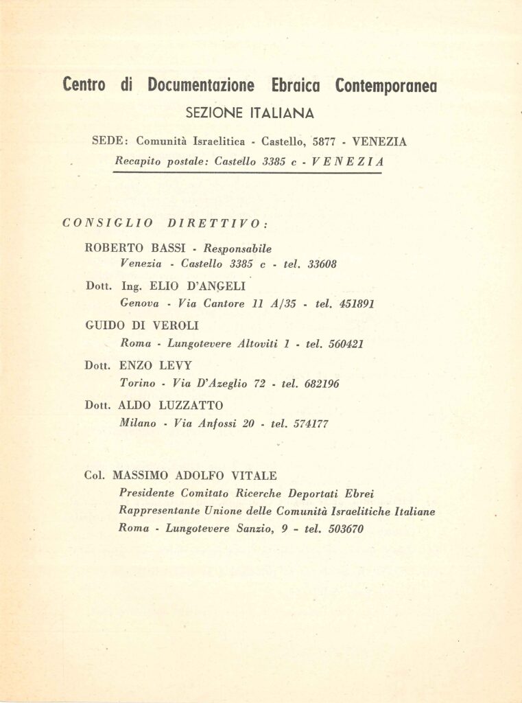 leggi tuttoLa direzione viene affidata a Roberto Bassi, giovane consigliere della FGEI e come riportato nel primo documento del Centro, «Tale CDEC, analogamente ai Centri già esistenti in altri Paesi, provvederà a raccogliere documentazioni, testimonianze, pubblicazioni, […] interessanti le persecuzioni antisemite in Italia, il contributo ebraico alla Resistenza, […] e successivamente a divulgarle».