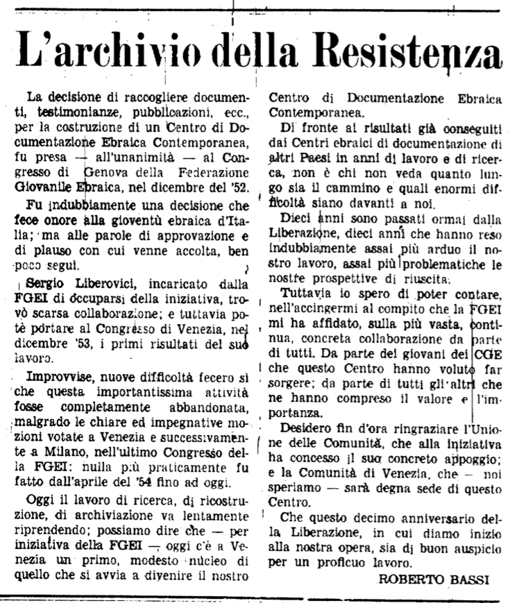L’idea di fondare un Centro di raccolta di documenti, testimonianze e pubblicazioni sulla partecipazione ebraica alla Resistenza emerge per la prima volta già al Congresso della Federazione Giovanile Ebraica d’Italia (FGEI) del 1952 a Genova. Tuttavia è solo nel 1955, in occasione del decimo anniversario della Liberazione, che su iniziativa della FGEI e sotto l’egida dell’Unione delle Comunità Israelitiche Italiane (oggi UCEI), viene fondato il Centro di Documentazione Ebraica Contemporanea CDEC.