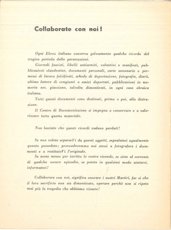 leggi tuttoLa direzione viene affidata a Roberto Bassi, giovane consigliere della FGEI e come riportato nel primo documento del Centro, «Tale CDEC, analogamente ai Centri già esistenti in altri Paesi, provvederà a raccogliere documentazioni, testimonianze, pubblicazioni, […] interessanti le persecuzioni antisemite in Italia, il contributo ebraico alla Resistenza, […] e successivamente a divulgarle».
