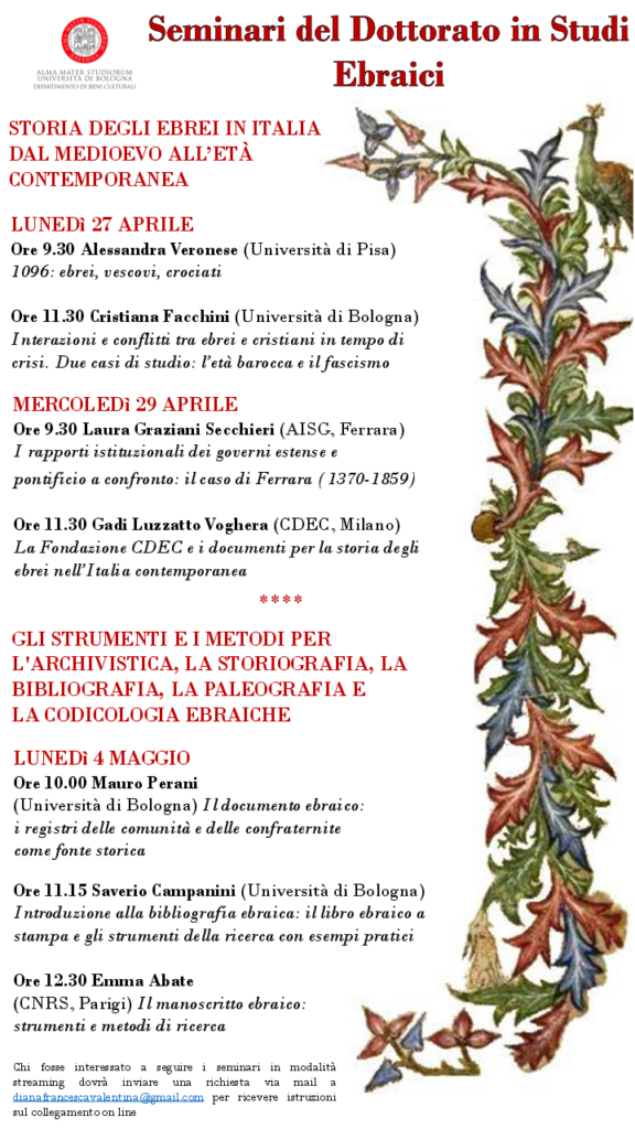 Tra il 27 aprile e il 4 maggio si tiene in streaming il seminario “Storia degli ebrei in Italia dal Medioevo all’età contemporanea”, organizzato dalla scuola di Dottorato di Studi Ebraici dell’Università di Bologna. Vi partecipano tra gli altri Mauro Perani, Alessandra Veronesi e Cristiana Facchini.