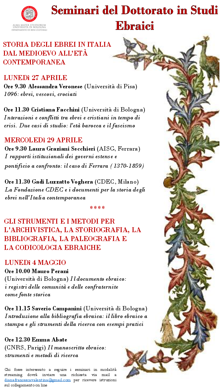 Tra il 27 aprile e il 4 maggio si tiene in streaming il seminario “Storia degli ebrei in Italia dal Medioevo all’età contemporanea”, organizzato dalla scuola di Dottorato di Studi Ebraici dell’Università di Bologna. Vi partecipano tra gli altri Mauro Perani, Alessandra Veronesi e Cristiana Facchini.